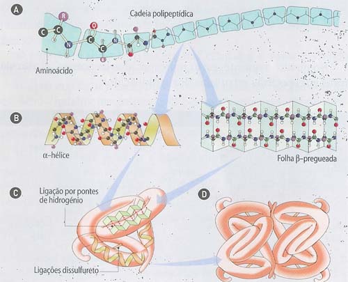 B – Cadeias da estrutura primária podem dispor-se paralelamente e ligar-se entre si por ligações de hidrogénio, formando uma estrutura em folha pregueada. As cadeias peptídicas podem enrolar--se em hélice, devido ao estabelecimento de pontes de hidrogénio entre grupos amina e carboxilo de aminoácidos diferentes. Esta conformação em hélice constitui o tipo mais comum.